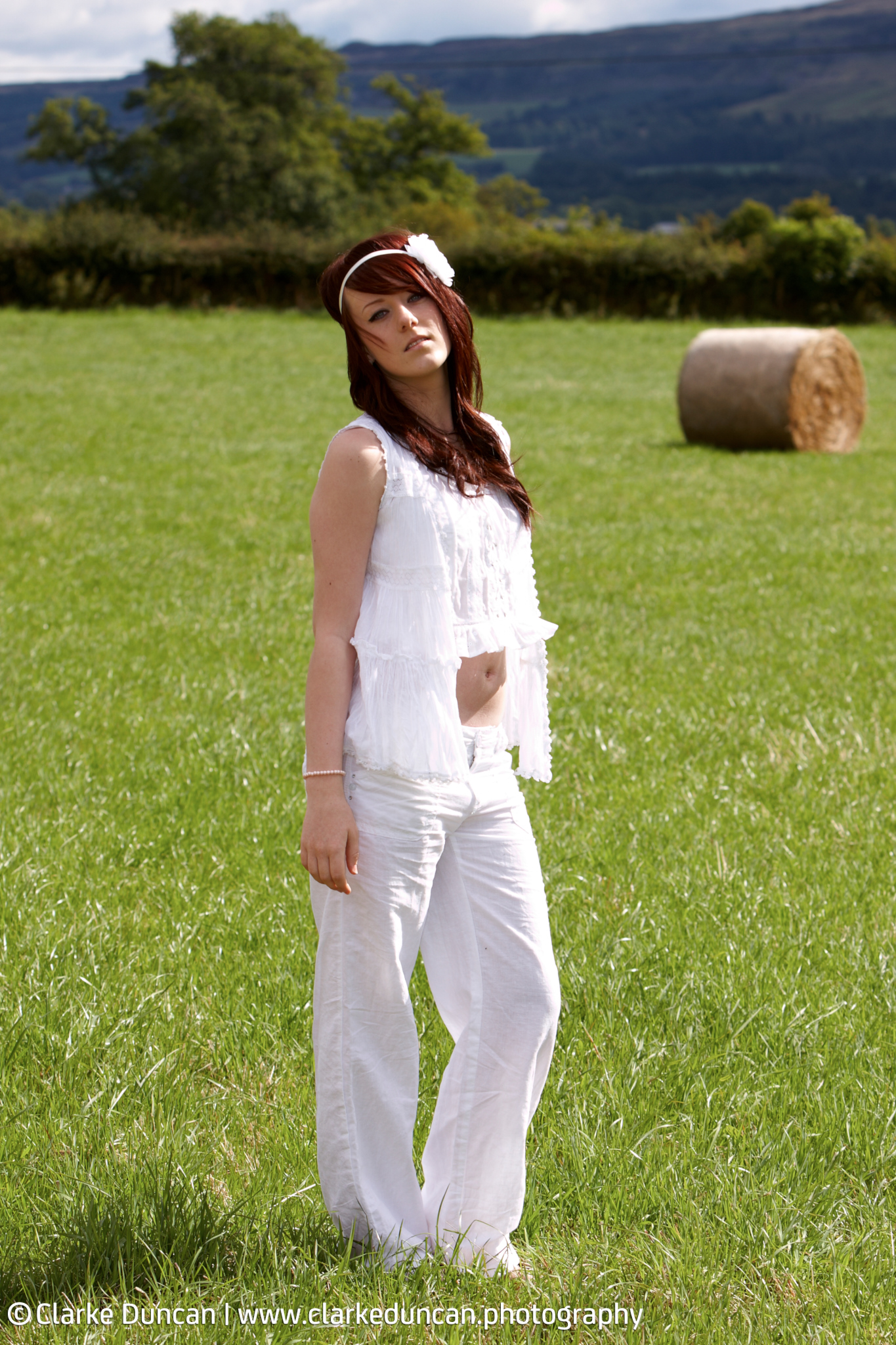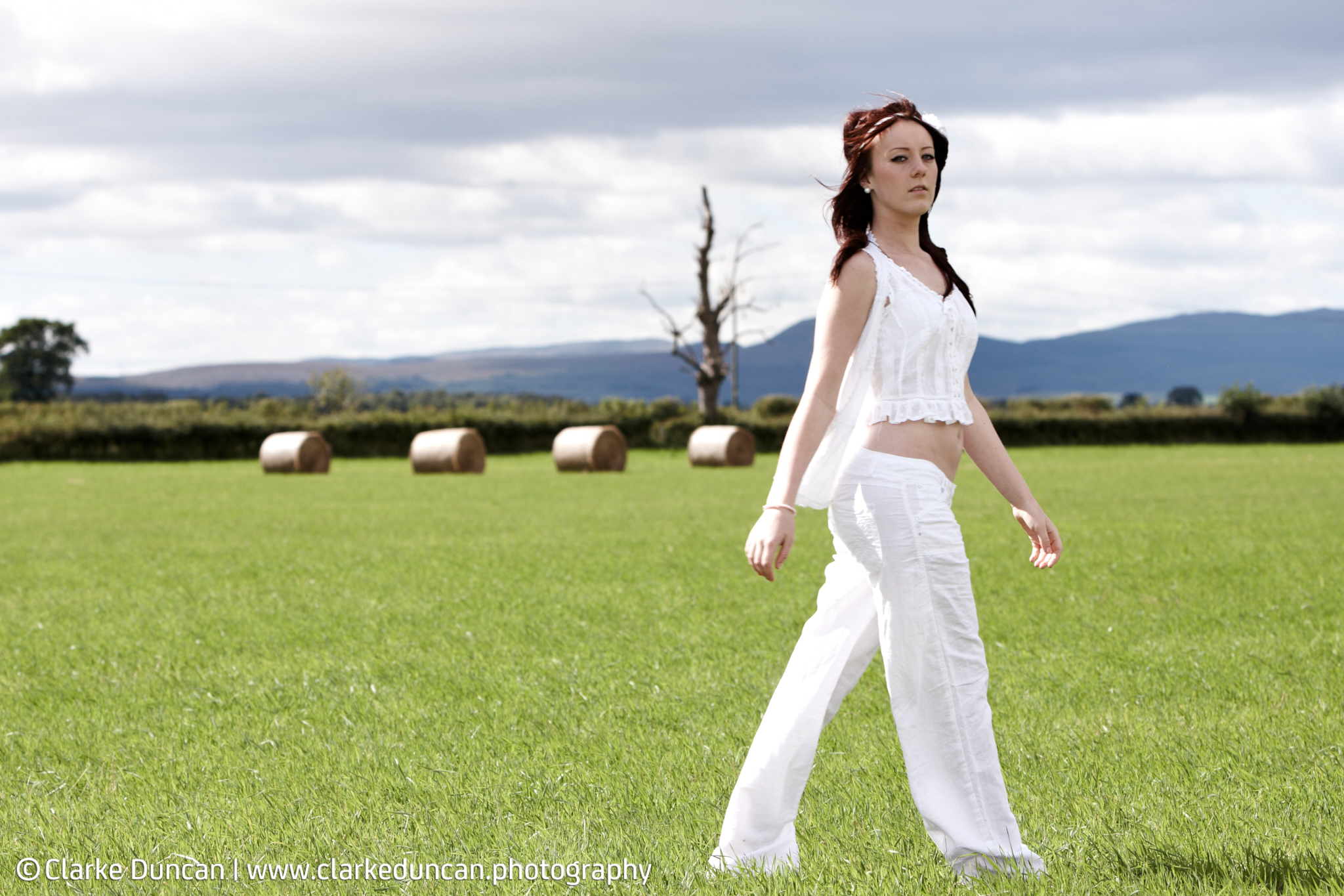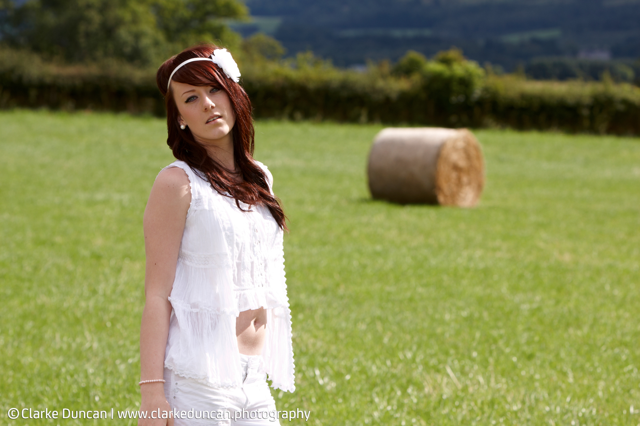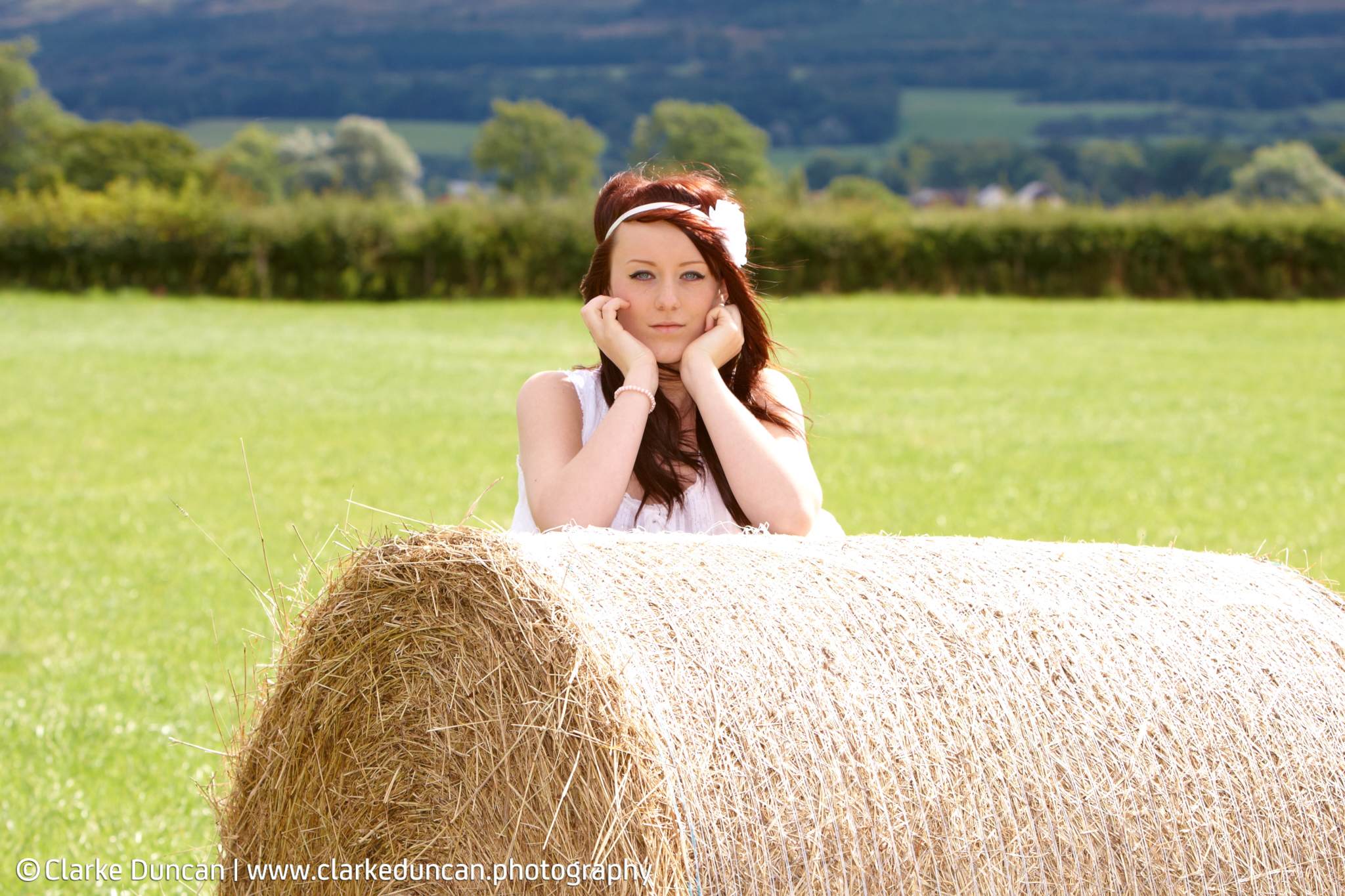 My idea here was to do a fashion style shoot in the countryside; ideally I was looking for bales of hay and a farmer that wouldn’t bring out a shotgun to chase us off his land ๐ We drove about central Scotland looking for the right farm and just so happened the farmer was about and we asked him if it would be ok to take some photos with hay bales in the background. Weather wise the day was fine however it was extremely windy but Stephanie handled brilliantly.