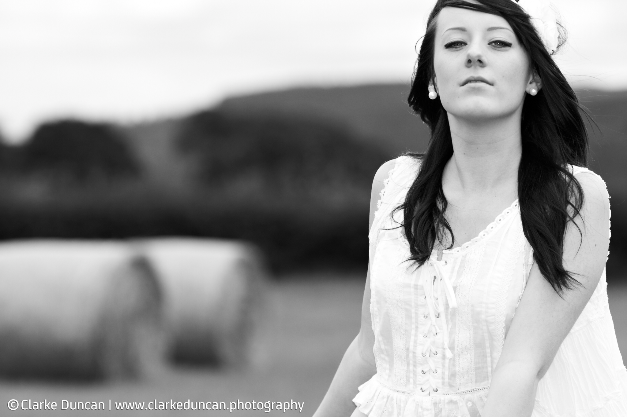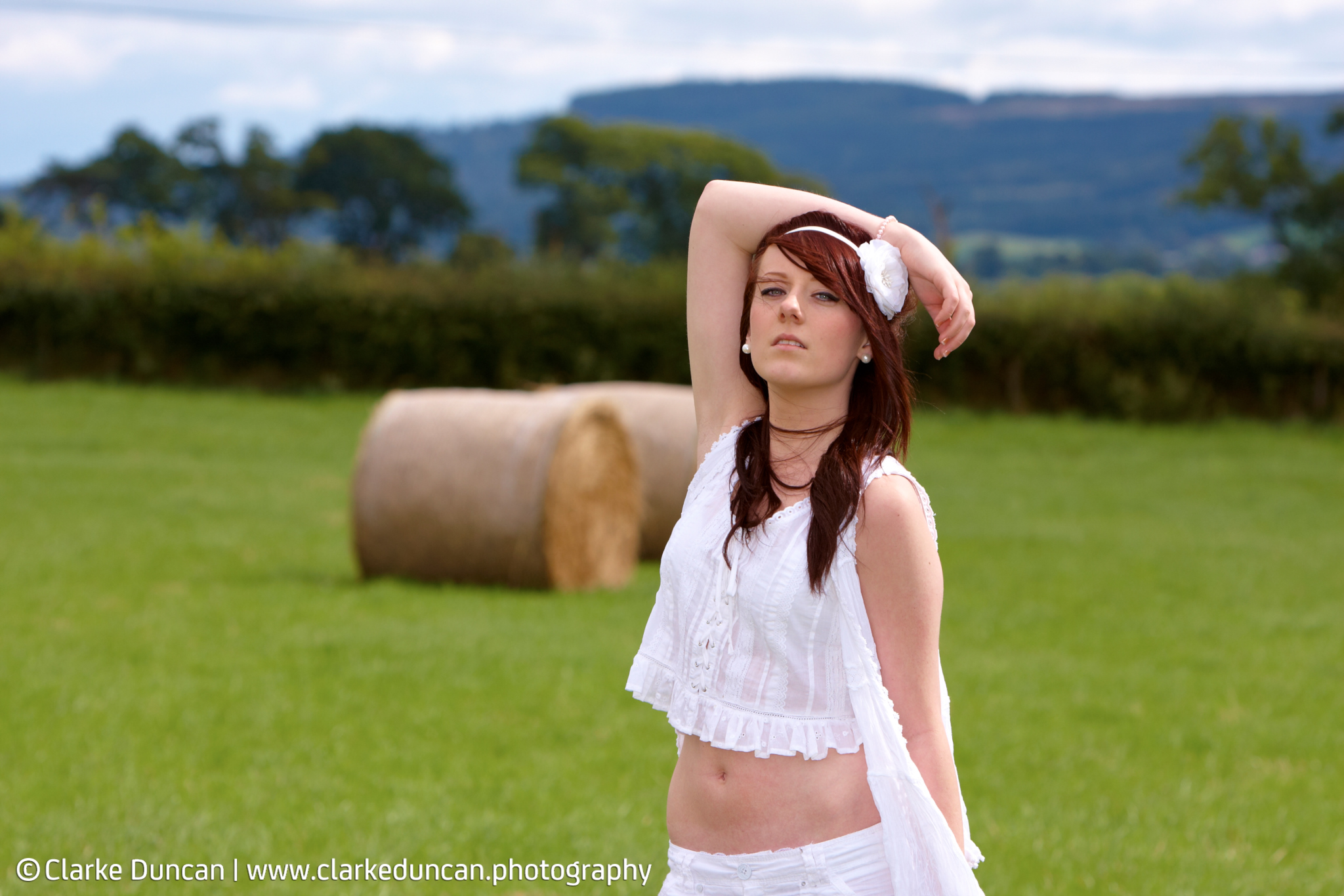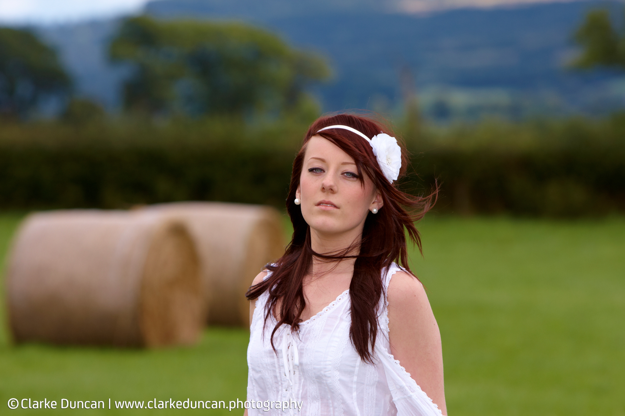 My idea here was to do a fashion style shoot in the countryside; ideally I was looking for bales of hay and a farmer that wouldn’t bring out a shotgun to chase us off his land ๐ We drove about central Scotland looking for the right farm and just so happened the farmer was about and we asked him if it would be ok to take some photos with hay bales in the background. Weather wise the day was fine however it was extremely windy but Stephanie handled brilliantly.