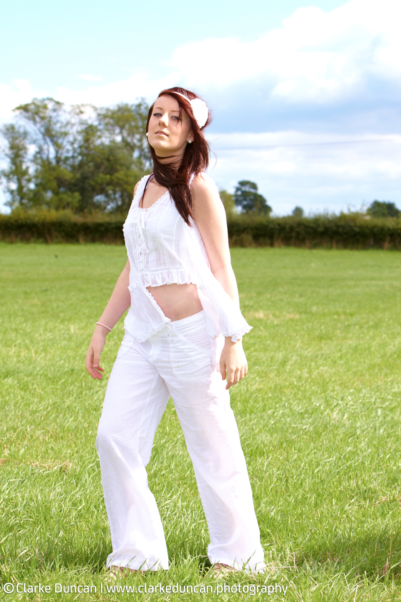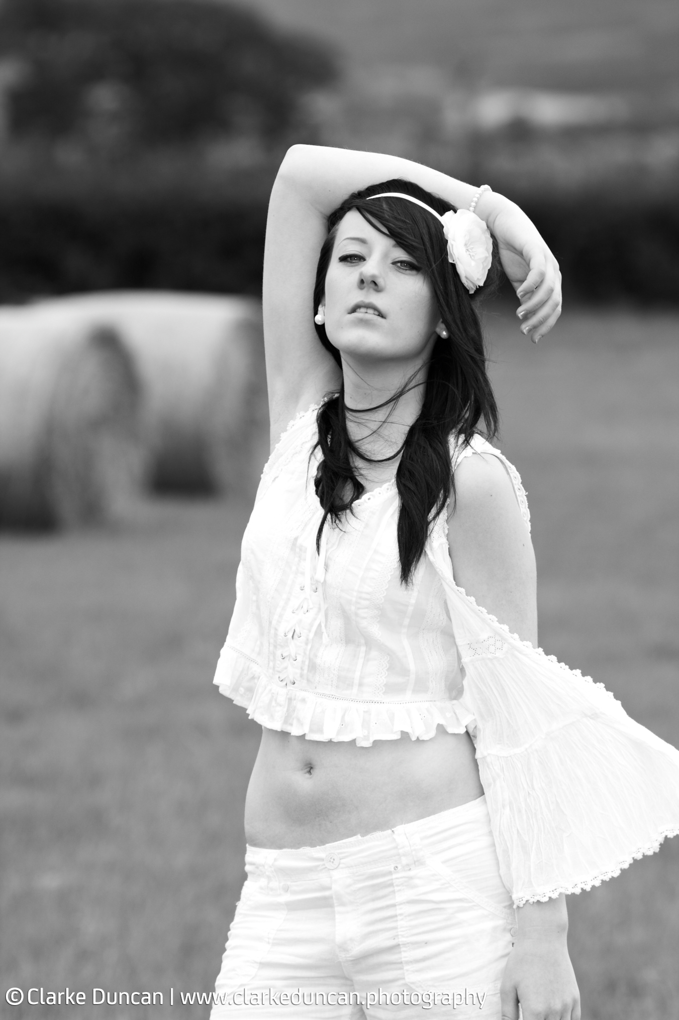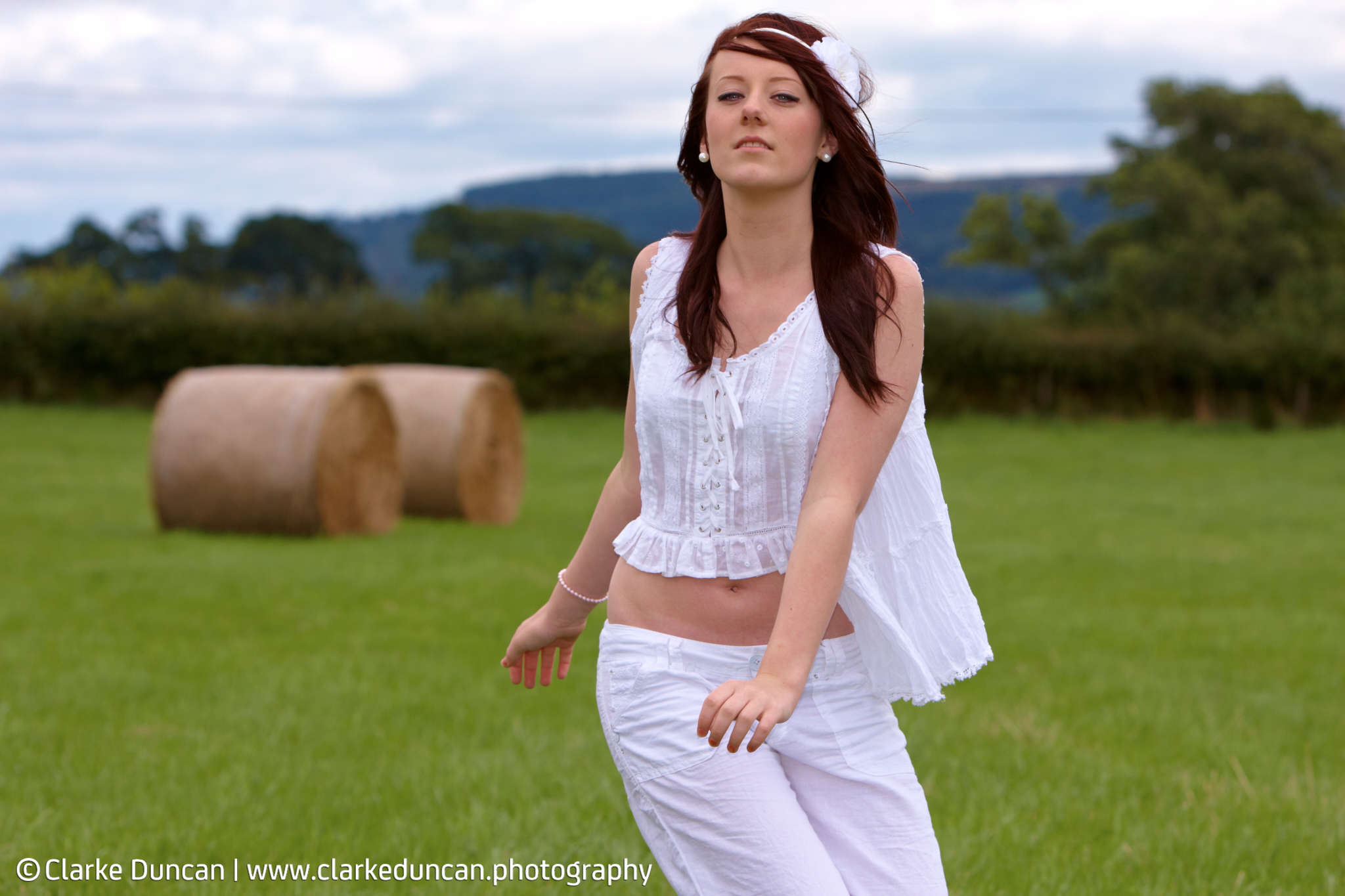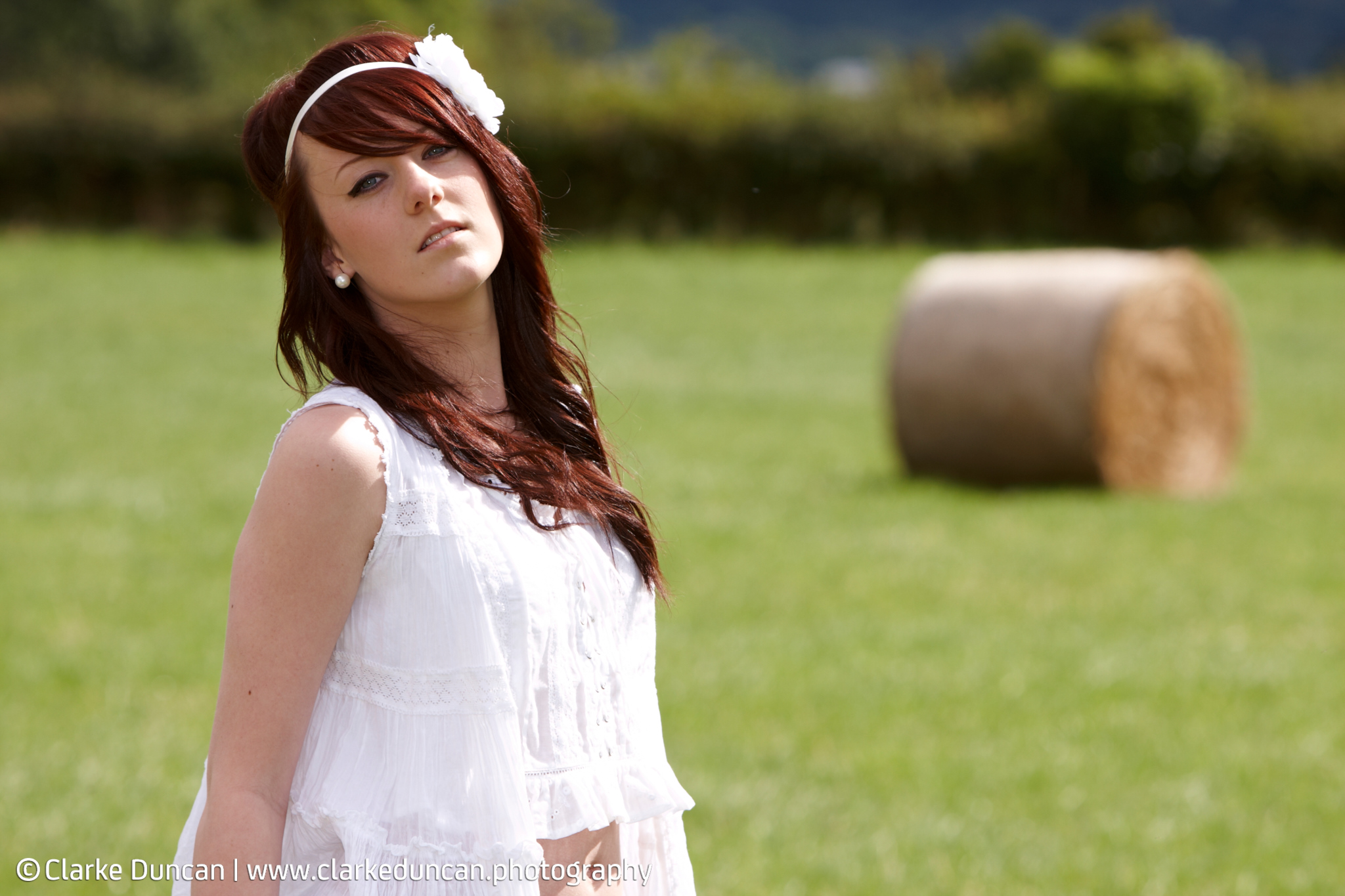My idea here was to do a fashion style shoot in the countryside; ideally I was looking for bales of hay and a farmer that wouldn’t bring out a shotgun to chase us off his land ๐ We drove about central Scotland looking for the right farm and just so happened the farmer was about and we asked him if it would be ok to take some photos with hay bales in the background. Weather wise the day was fine however it was extremely windy but Stephanie handled brilliantly.